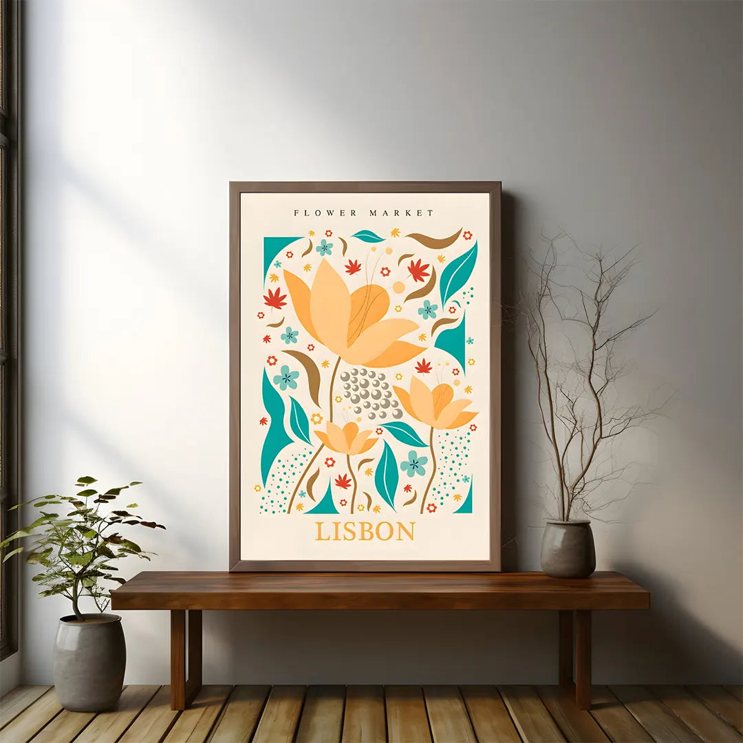 This beautiful poster of Lisbon with yellow text features a lively illustration of colorful flowers and plants typical of Portugal's capital. Known for its subtropical climate, Lisbon is filled with beautiful gardens and parks that are home to a variety of exotic plants and flowers. This poster is the perfect way to bring some of Lisbon's charm and beauty into your home or office.